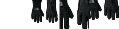 Made of ultra soft fleece, these touchscreen-compatible gloves also have superior grip in cold conditions. 325 g/m2 100% recycled polyester double knit fleece Silicone gripper dot print on palm for better grip Etip functionality works with touchscreen devices Zigzag stitch with elastic on palm-side of wrist for better fit Snaps at cuffs helps keep gloves together when not being worn Embroidered The North Face logo on top of glove Small: 6.5 to 7-inch hand circumference Medium: 7.5 to 8-inch hand circumference Large: 8+-inch hand circumference